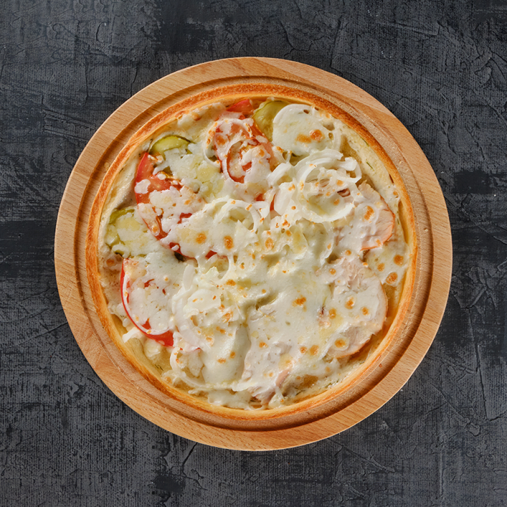 Соус чесночный, куриная грудка копченая, помидоры, огурцы маринованные, лук маринованный, сыр