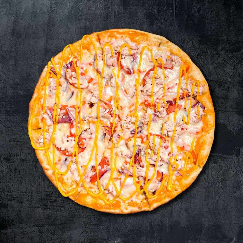 Курица ,соус бургер, помидоры, перец болгарский, лук красный, сыр, соус горчичный