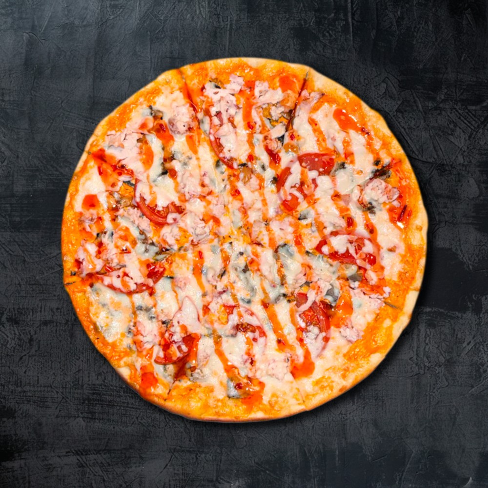 Курица, помидоры, грибы шампиньоны, сыр, паста Том Ям, соус шрирача, майонез, соус сладкий чили