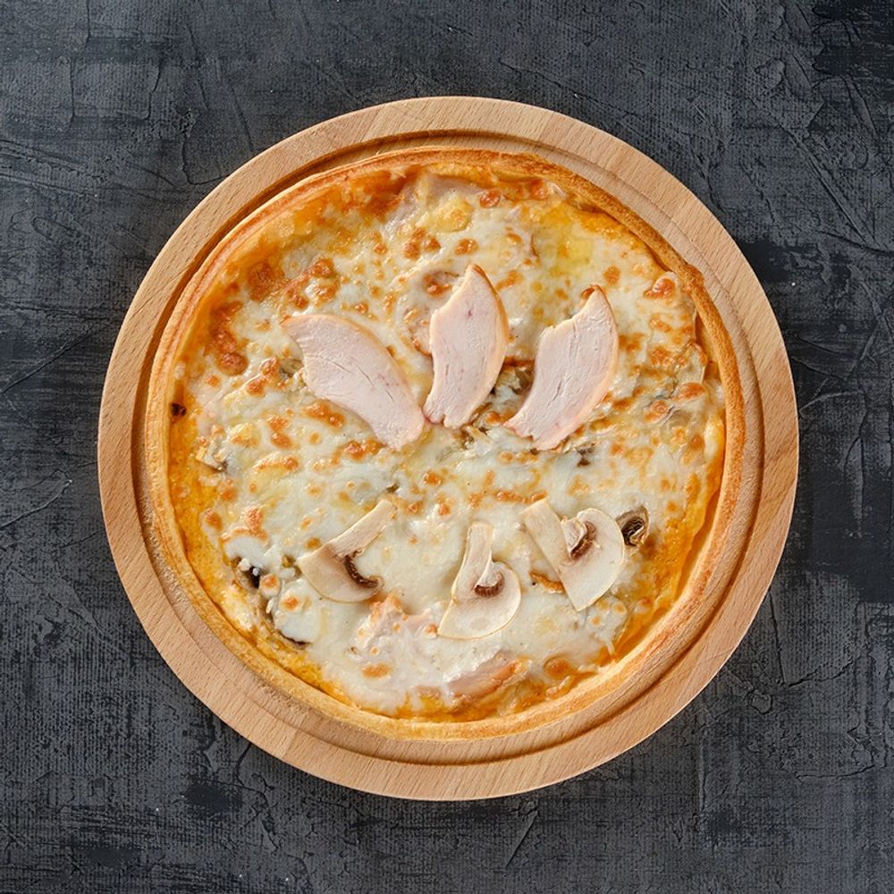 Соус-пицца, шампиньоны, куриная грудка копченая, сыр