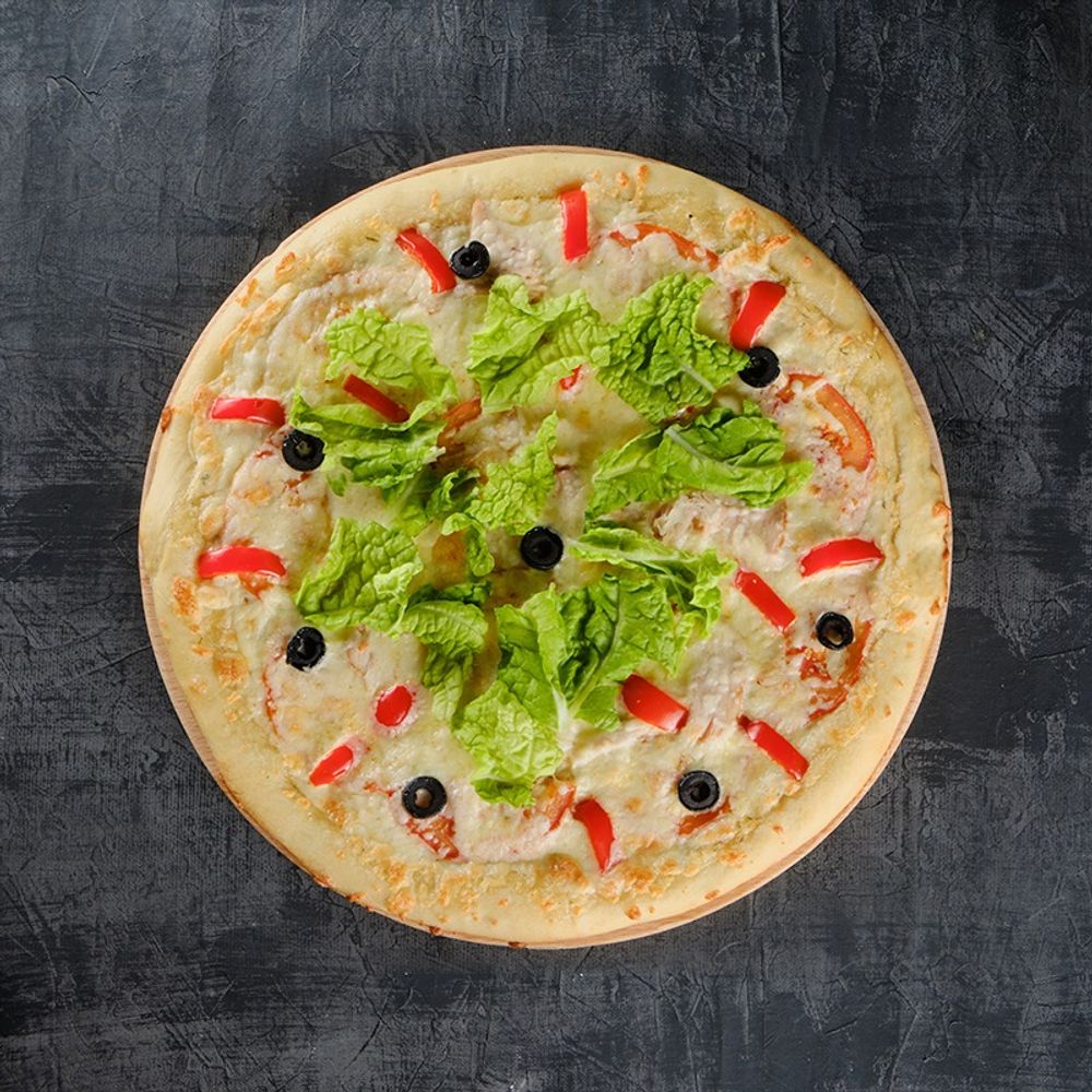 Соус чесночный, куриная грудка копченая, томаты, перец болгарский, маслины, сыр, капуста пекинская